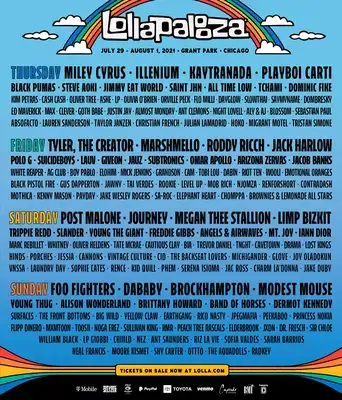 Apenas duas semanas após o anúncio de seu retorno ao Grant Park em Chicago, de 29 de julho a agosto. 1 com capacidade total, o Lollapalooza 2021 O dia até o dia foi anunciado, além da venda de ingressos para aprovação geral, VIP e Platinum um dia.